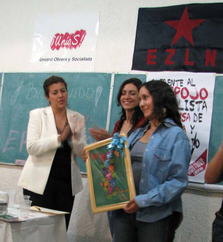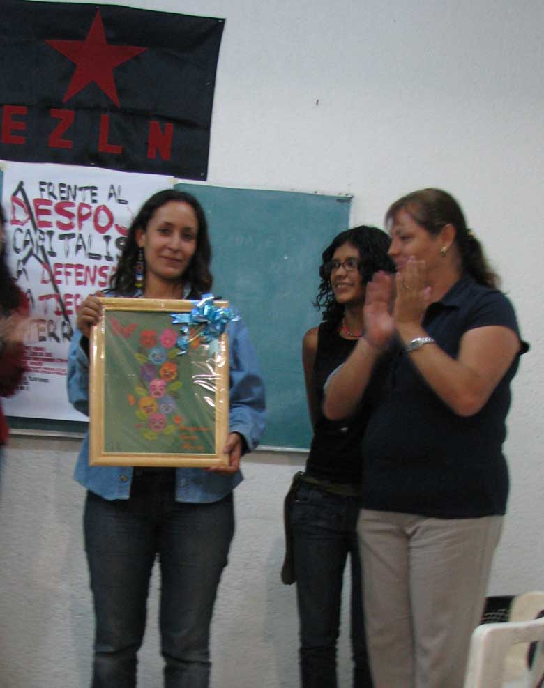 Y estas son unas fotos de la entrega del cuadro a la compañera Tamara, de la Otra Puebla, que le hará llegar al compañero Raúl el cuadro que él escogió.