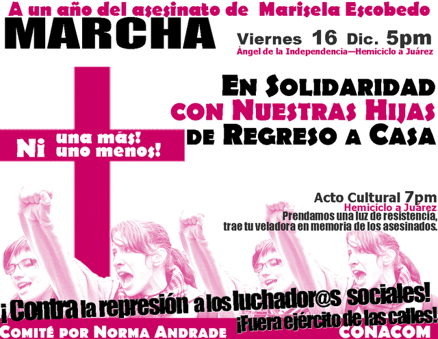 El 16 de diciembre de 2010 Marisela Escobedo fue asesinada con la mayor impunidad afuera del Palacio de Gobierno del Estado de Chihuahua, en donde permanecía demandando justicia para su hija asesinada Rubí Marisol, luego de que un tribunal liberara a su asesino confeso Sergio Rafael Barraza Bocanegra. Estos asesinatos se suman a una larga lista en el estado de Chihuahua y particularmente en Ciudad Juárez, en donde ser mujer ha sido un factor de riesgo, en medio de una cadena de corrupción que permite que los feminicidios permanezcan impunes.