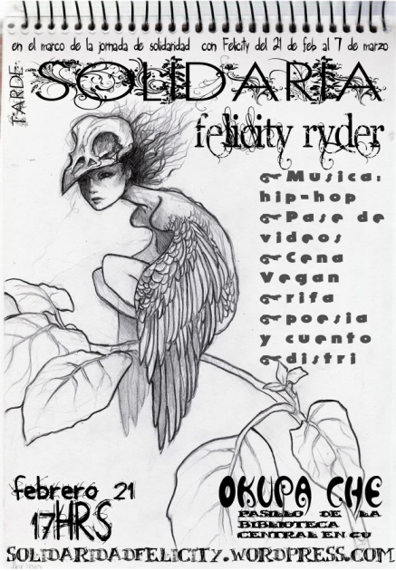 Sabemos que en cualquier lugar donde se encuentre nuestra compañera Felicity, sigue firme en sus convicciones de anarquista y burlándose del enemigo, sin dejar de atacarlo, cara a cara. Desde aquí le mandamos un caluroso saludo y convocamos a todxs los esfuerzos antiautoritarios a realizar una semana de actividades, saludos y gestos solidarios con nuestra compañera Felicity, del 21 de febrero al 7 de marzo, cada quien(es), en su tiempo y forma, para que sepa que no está sola y que la solidaridad entre anarquistas de lucha no es solo palabra escrita o un adorno en los bonitos panfletos “revolucionarios”.