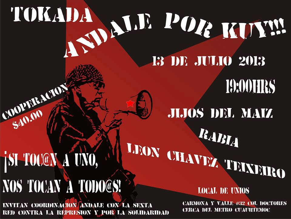 Como adherentes a las Sexta Declaración de la Selva Lacandona, reafirmamos nuestro principio de que si tocan a un@, tocan a tod@s. Como integrantes de la Red contra la Represión y por la Solidaridad asumimos el compromiso de realizar acciones conjuntas para que esos, y otros hechos, no queden en la impunidad y poder ayudar a la recuperación pronta de nuestro compañero Kuy.