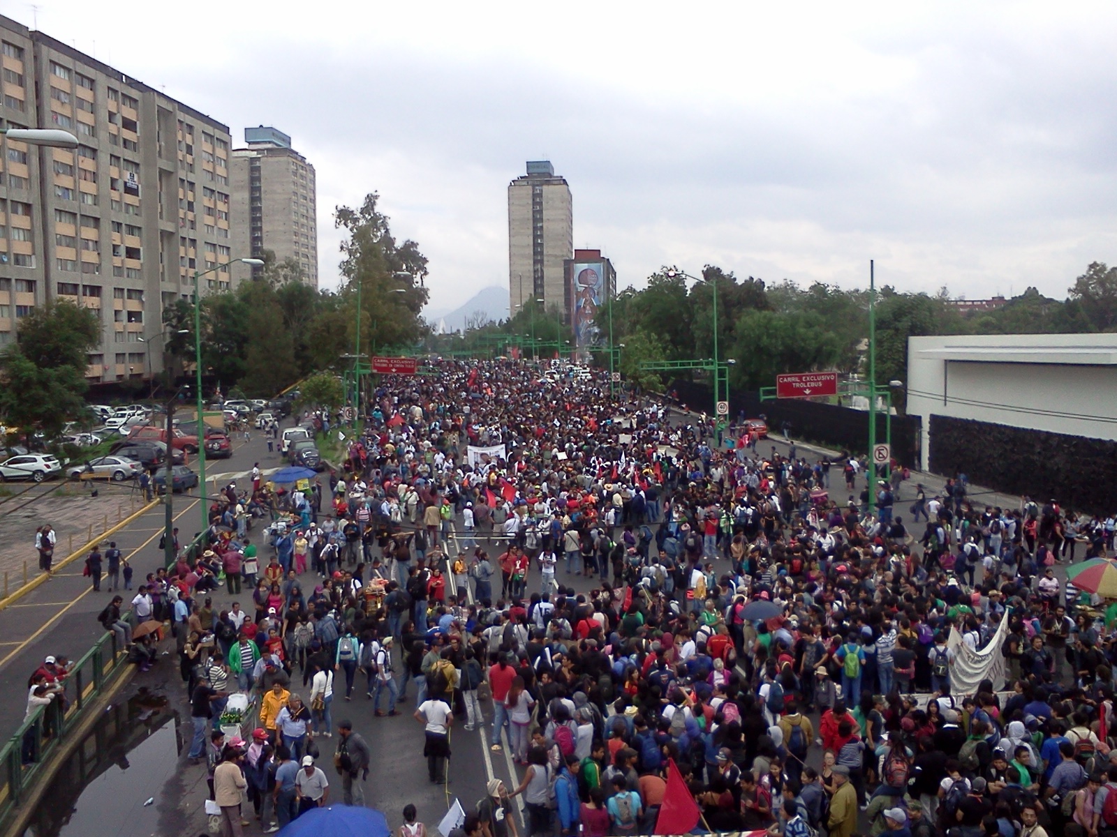 Imagen de la Marcha realizada este 18 de septiembre en la Ciudad de México, donde la dirigencia de la CNTE decidió cambiar el objetivo inicial de recuperar el Zócalo (acordonado y blindado por el Estado Mayor, 1500 polícias federales y 2400 policias de la SSPDF sobre el Eje Central) y encamino la marcha a la Plaza de las Tres Culturas en Tlatelolco.