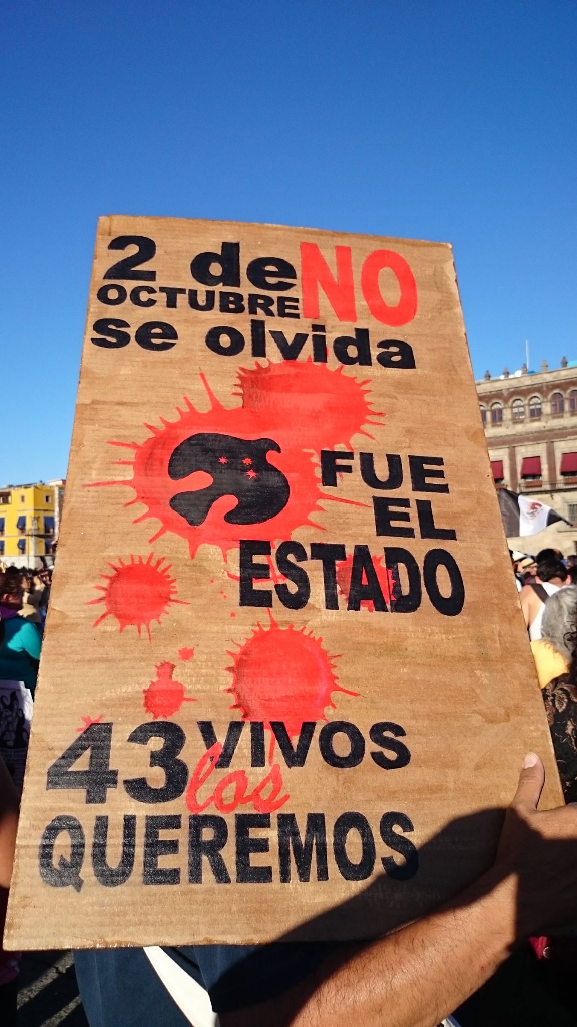 Viernes 2 de octubre en la Ciudad de México, a 47 años de la masacre de Tlatelolco, transcurre como cada año, una marcha que recuerda la masacre de Tlatelolco. Pero esta vez los líderes del 68 ya no encabezaban solos la marcha, también los acompañaban los familiares de los 43 normalistas desaparecidos por el Estado.