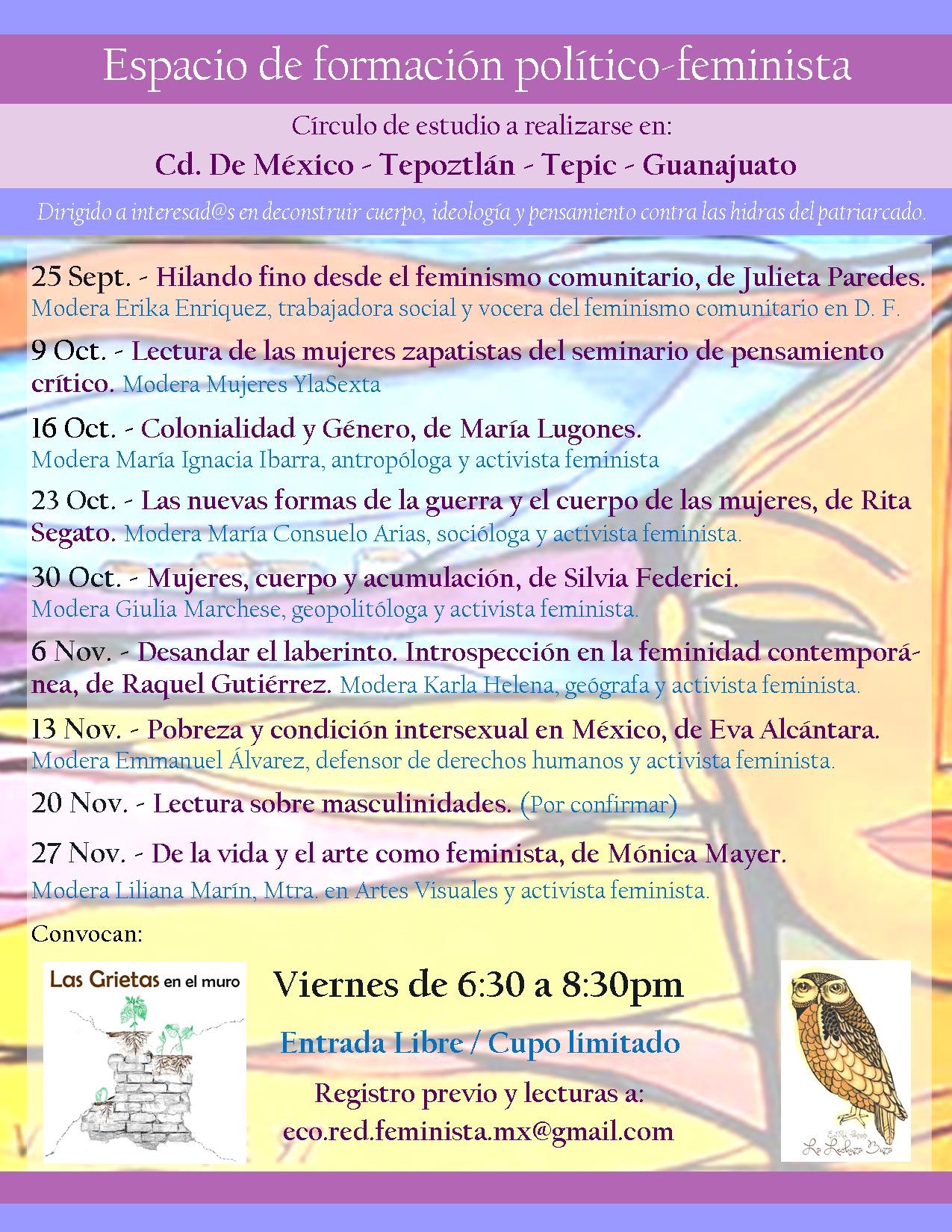 El proyecto de formación político-feminista es un espacio autónomo de aprendizaje colectivo. La idea surge por la necesidad de crear un espacio de discusión y aprendizaje feminista para las compañeras y compañeros de «Las grietas en el muro» (grupo conformado a raíz del seminario de pensamiento crítico frente a la hidra capitalista).
