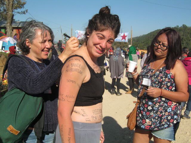 Y entre otras tantas desconocidas gigantes que no hay libro que las aguante, estuvieron también, seguro que si, las mujeres espíos, las mujeres infiltrados. Que no entendieron nada y solo salieron choqueadas del interior curvo y un poco rasposo del Caracol Zapatista. Y del brazo anduvieron por ahí también algunas gringas con braunis, colombianos con cámara dron, españolas en la playa y periodistas descanchadas. Tal vez los sistemas y los directorios ya lo sepan todo de nosotras, ya nos tomaron foto y video; dalo por hecho que ya estamos en sus registros de peligrosidad, clasificadas como locas, pero, aun y con todo, ahí, sobre territorio libertado: florecimos, brotamos celestes y contentas, las viajeras y las zapatistas; logramos producir y participar de tan importante Encuentro, quizá el último de la era. Un festival feminista del que se dirá que se escuchó la batucada entre los cerros, que sonó al grito único y estelar de las miles de voces coreando al ritmo de los tambores: NO TENEMOS MIEDO!! y por un momentito cúspide, una lesbocracia esbozó su canción.