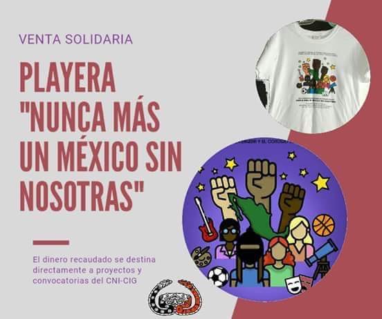 VENTA SOLIDARIA con el CIG-CNI, playera “Nunca más un México sin nosotras” del primer encuentro nacional de mujeres realizado en julio pasado, escribe mensaje directo para mayores informes. Envíos a diferentes partes del país.