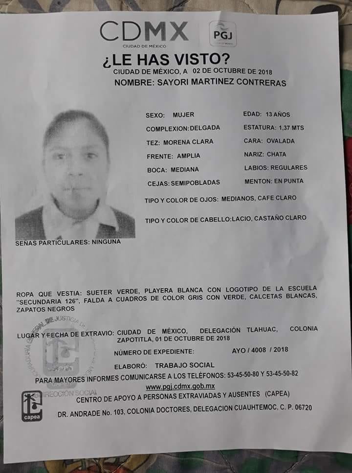 Sayori Martínez Contreras desapareció en Tláhuac el 2 de oct