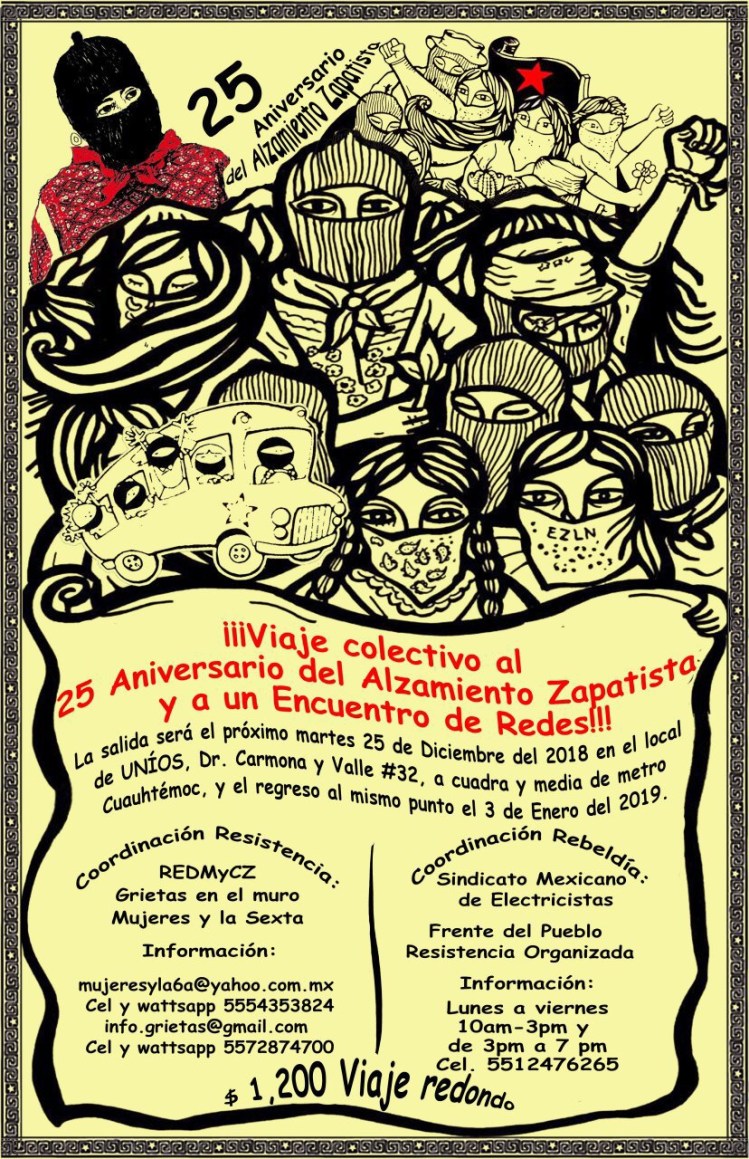 Viaje Colectivo al 25 aniv del alzamiento del EZLN y a un encuentro de redes Publicado pormujeresylasextaorg30/11/201807/12/2018Publicado en Uncategorized http://enlacezapatista.ezln.org.mx/2018/11/29/viaje-colectivo-al-25-aniversario-del-alzamiento-zapatista-y-a-un-encuentro-de-redes/ http://enlacezapatista.ezln.org.mx/2018/11/17/invitacion-a-la-celebracion-del-25-aniversario-del-alzamiento-zapatista-y-a-un-encuentro-de-redes/ Comparte esto: Comparte en Facebook (Se abre en una ventana nueva) Facebook Compartir en WhatsApp (Se abre en una ventana nueva) WhatsApp Compartir en X (Se abre en una ventana nueva) X Enviar un enlace a un amigo por correo electrónico (Se abre en una ventana nueva) Correo electrónico Compartir en Telegram (Se abre en una ventana nueva) Telegram Más Compartir en Tumblr (Se abre en una ventana nueva) Tumblr Imprimir (Se abre en una ventana nueva) Imprimir Compartir en LinkedIn (Se abre en una ventana nueva) LinkedIn Me gusta Cargando... Relacionado Publicado por mujeresylasextaorg Mujeres que Luchan, adherentes a la Sexta Declaración de la Selva Lacandona. Anti patriarcales y Anticapitalistas Ver más entradas