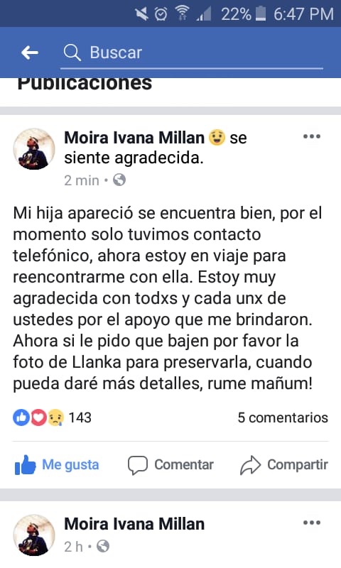 Ya apareció Llanka Millán, hija de la entrañable Compañera, Moira Millán, defensora Mapuche quien había desaparecida desde el jueves 20 de dic.