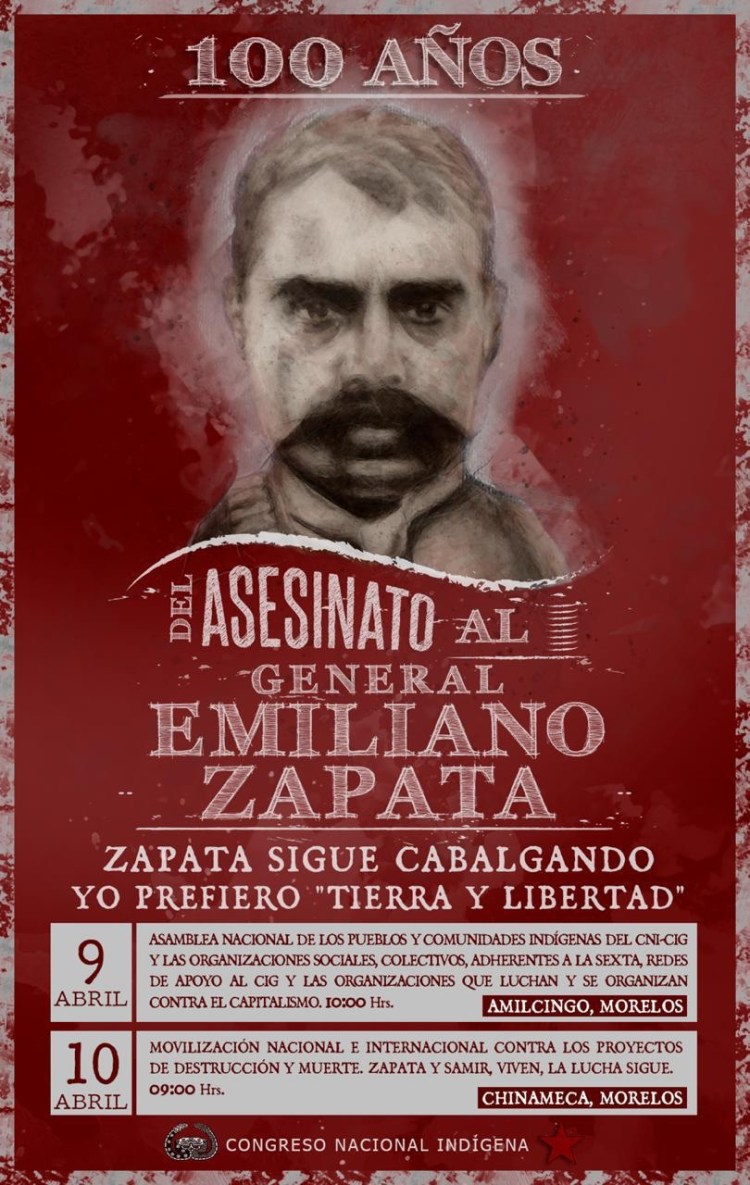 Recordando que la lucha encabezada por el General EMILIANO ZAPATA SALAZAR y el Ejército Libertador del Sur y Centro representaron y siguen representando los intereses y aspiraciones de nuestros pueblos y de millones de explotados y explotadas en México y en el mundo; y que este próximo 10 de abril se cumplen 100 AÑOS DEL COBARDE ASESINATO DEL GENERAL EMILIANO ZAPATA SALAZAR por parte del régimen político que, a pesar de sus “transformaciones”, nos sigue gobernando hasta el día de hoy: