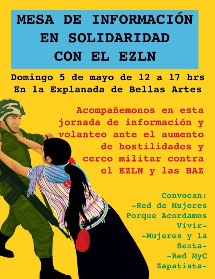 Mesa de Información en Solidaridad con el EZLN, dom 5 de Mayo de 12 a 17 hrs Publicado pormujeresylasextaorg03/05/201904/05/2019Publicado en MUJERES EN LUCHA !Te esperamos! http://enlacezapatista.ezln.org.mx/2019/05/03/mesa-de-informacion-y-volanteo-en-solidaridad-con-el-ezln-domingo-5-de-mayo-de-12-a-17-horas-explanada-de-bellas-artes/ Comparte esto: Haz clic para compartir en Facebook (Se abre en una ventana nueva) Facebook Haz clic para compartir en WhatsApp (Se abre en una ventana nueva) WhatsApp Haz clic para compartir en X (Se abre en una ventana nueva) X Haz clic para enviar un enlace por correo electrónico a un amigo (Se abre en una ventana nueva) Correo electrónico Haz clic para compartir en Telegram (Se abre en una ventana nueva) Telegram Más Haz clic para compartir en Tumblr (Se abre en una ventana nueva) Tumblr Haz clic para imprimir (Se abre en una ventana nueva) Imprimir Haz clic para compartir en LinkedIn (Se abre en una ventana nueva) LinkedIn Me gusta Cargando... Relacionado Publicado por mujeresylasextaorg Mujeres que Luchan, adherentes a la Sexta Declaración de la Selva Lacandona. Anti patriarcales y Anticapitalistas Ver más entradas