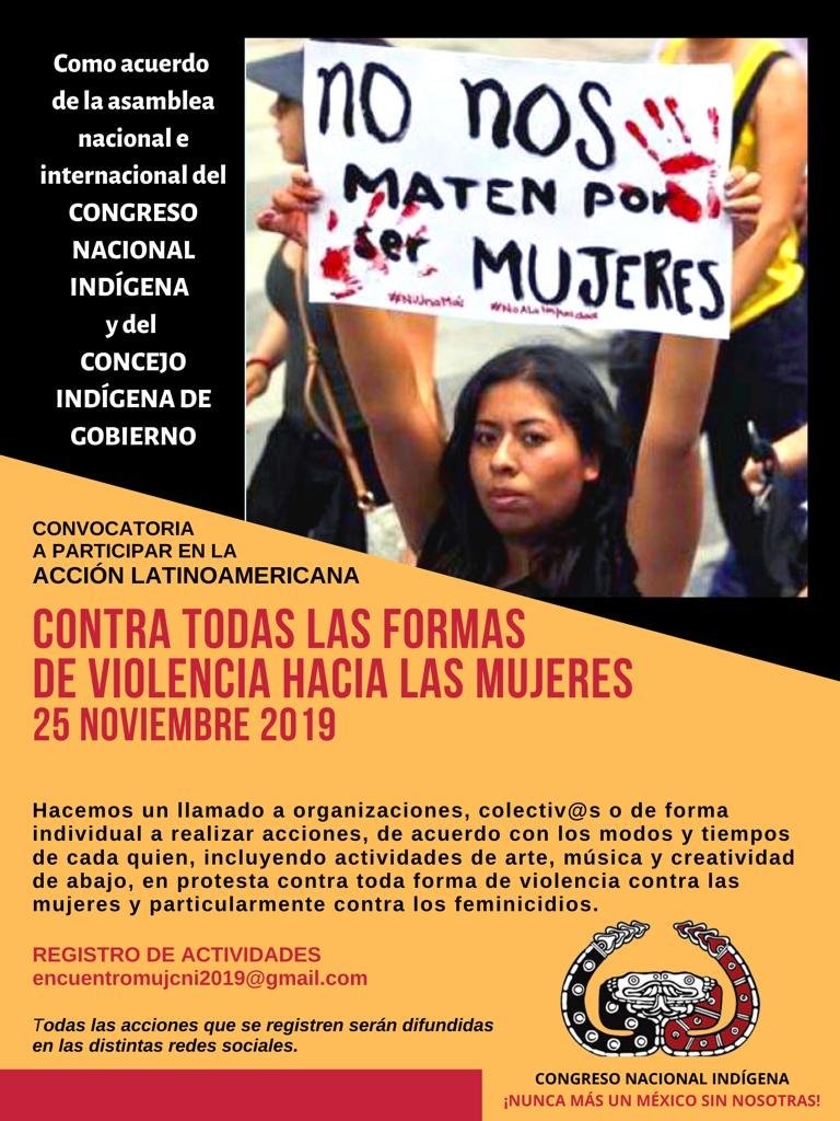 Hacemos un llamado a todas las compañeras del CNI, de las redes de apoyo, de las organizaciones y colectiv@s o de manera individual y a los compañeros participantes de nuestras luchas antipatriarcales y anticapitalistas, a realizar acciones artísticas, musicales, políticas, creativas de abajo y a la izquierda, de acuerdo con los modos y tiempos de cada quien, en protesta contra toda forma de violencia contra las mujeres y particularmente contra los feminicidios, el día 25 de Noviembre, sumándonos a las acciones que se realizaran a lo largo y ancho de nuestra América Latina en lucha y resistencia.