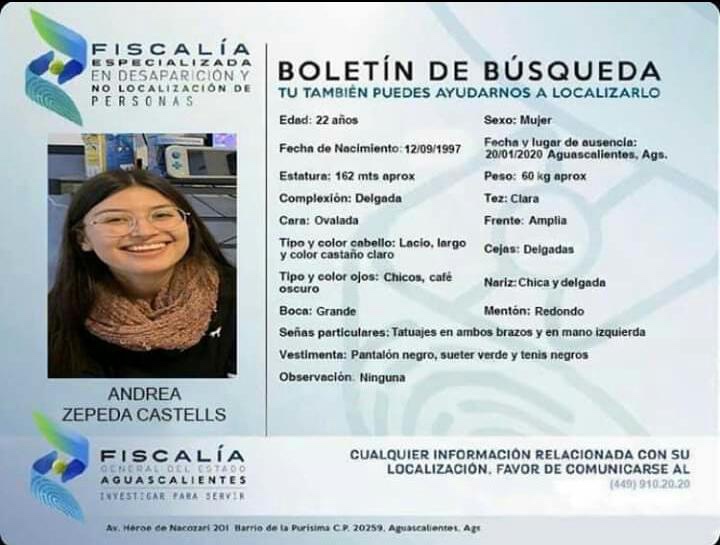 Andrea Zapeda Castells ha desaparecido en Aguascalientes el 20012020