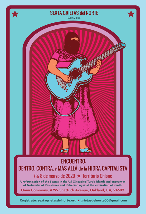Este llamado es para todxs lxs compañerxs que luchan y resisten la explotación capitalista y la opresión patriarcal dentro de los Estados Unidos, especialmente a los adherentes a la Sexta Declaración de la Selva Lacandona y aquellos que se identifican con la lucha y el pensamiento Zapatista, así como con los pueblos del Congreso Nacional Indígena (CNI).