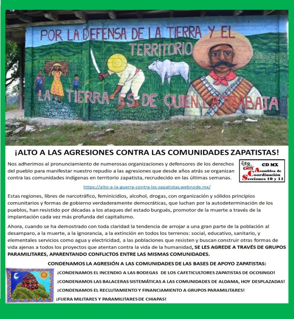 Alto a las agresiones contra las Comunidades Zapatistas, CNTE Secciones 9 y 10
