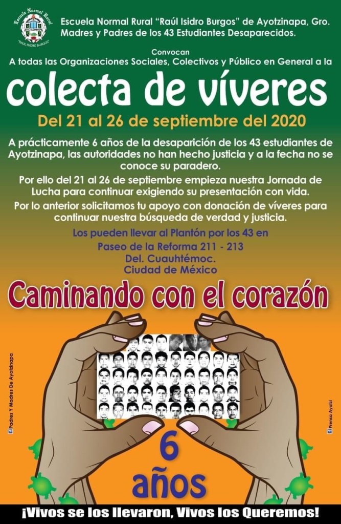Madres y Padres de los 43 desaparecidos y Normalistas de Ayotzinapa, nos piden nuestro apoyo para una colecta de víveres para la jornada que se llevará esta semana en la CDMX. Apoyemos lo justo , apoyemos la lucha de 6 años donde sus hijos, nuestro Compas fueron desaparecidos por el Estado y en donde todos juntos los encontraremos.