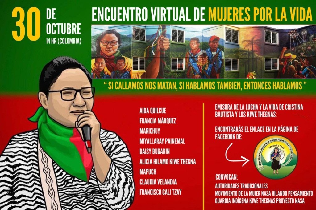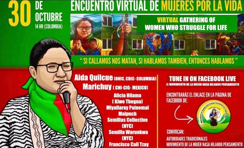 🎥 Via Facebook Live ( link- below) 🔥Encuentro Virtual de las Mujeres que Luchan Por la Vida: 🕯En memoria de la LUCHA y la VIDA de Cristina Bautista y los Kiwe Thegnas, Asesinad@s hace 1 año por defender a la madre tierra. 🌍 Desde el Cauca, Colombia convocado por las autoridades tradicionales Mujer Nasa Hilando Pensamiento Guardia Indigena/ compañeras de Cristina Bautista. Contaremos con la presencia de 🌸Aida Quilcue ( ONIC- CRIC – Colombia ) y 🌸Marichuy – ( CIG-CNI – México ) Encontraras el enlace en la pagina de Facebook de Movimiento de la Mujer Nasa Hilando Pensamiento.