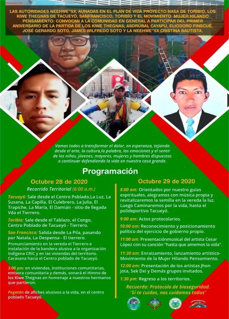 “Compañerxs guerreros de los diferentes territorios, aquí les compartimos la programación para que desde sus territorios, desde sus sentires o presencialmente se unan al acto conmemorativo en memoria de la vida y lucha de Cristina Bautista y los kiwe thegnas, al cuerpo lo han de matar pero sus luchas caminarán el territorio por el buen vivir, por ti, por mi, por ellos, por todas y todos la lucha sigue!!”