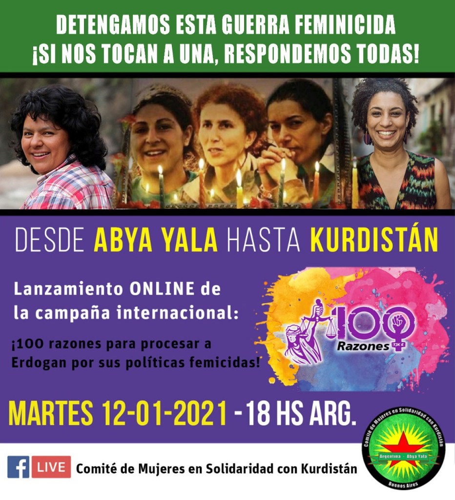 👉🏽 Compañeras! Este martes 12 de enero se estará realizando en Argentina el lanzamiento de la campaña 100 Razones para enjuiciar a Erdogan Entre hoy 10 y mañana 11 de enero se estará trabajando en un video que relate el documento. Para eso les queremos pedir que nos envien fotos con consignas: