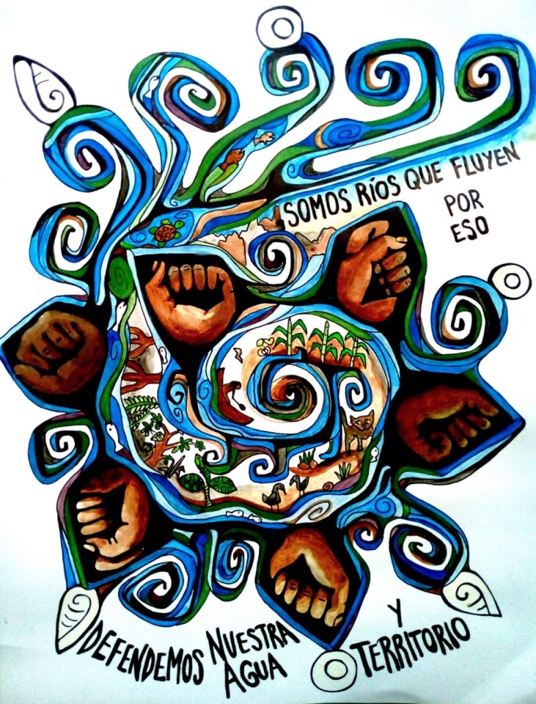 La defensa del agua y el territorio han sido regados con sangre de nuestras hermanas que hoy se juntan y corren junto con el agua en continua rebeldía. Bertha Cáceres y Macarena Valdés, siguen alimentando los cuerpos de agua, a ratos en forma de manantiales, y en otros ratos se juntan con Cristina Bautista y las flores que vienen de Morelos formando grandes cataratas o saltos imponentes de agua como sus voces rebeldes clamando Justicia para los ríos.