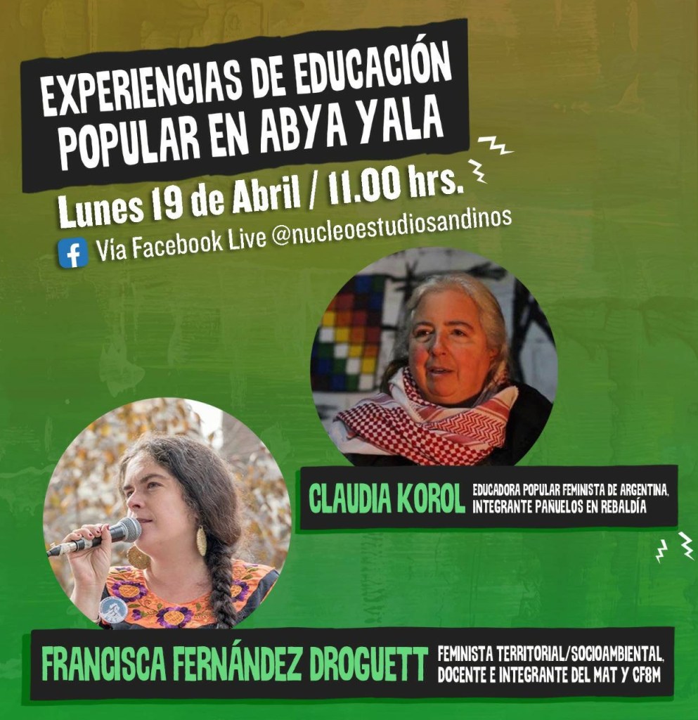 Mañana lunes 19 de abril, a las 11 hrs, se realizará un conversatorio sobre experiencias de educación popular en Abya Yala (América Latina), en que estaré dialogando con la educadora popular argentina Claudia Korol, a quien admiro profundamente.