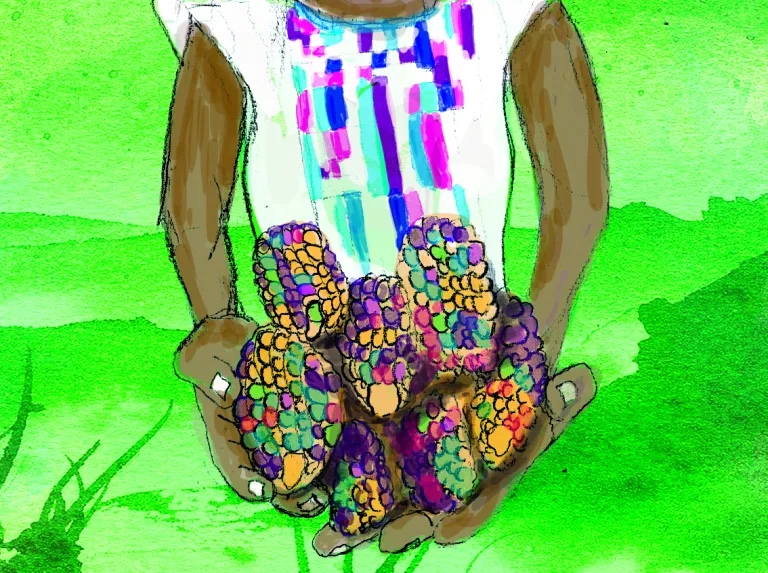 Tiempo después, ahí andaban los maíces de un lado a otro, trabajando para que tuvieran fuerza los hombres y mujeres y otroas que estaban construyendo el mundo. Pero nadie le hacía caso a los maíces pequeñitos, los burlaban y los despreciaban. Y todos los maicitos pequeños están como tristes porque nadie los toma en cuenta. Entonces en la cabeza de un grupo de maíz pequeño llegó el pensamiento de que no está cabal así, que por qué los desprecian y no los toman en cuenta. Y se inconformó. Y ahí está el grupo de maicitos pequeñitos inconformados. Y los demás maíces pasaban y decían: “bueno, pues ahí está ese grupo de maicitos inconformados, pero son muy pequeñitos, nadie los va a tomar en cuenta.”