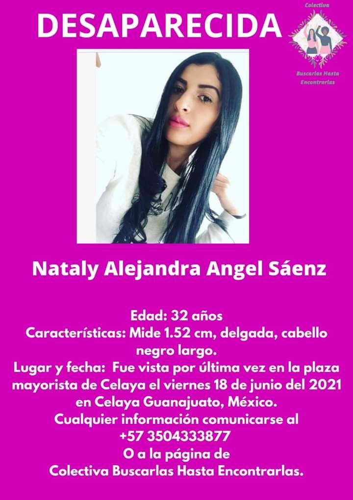 Este es el caso de la colombiana Nataly Alejandra Ángel Saénz quien desapareció el 18 de junio de 2021 en Celaya, Guanajuato. Le ofrecieron a ella una posibilidad de trabajo en México, para mejorar su calidad de vida, pero pasado un mes de su llegada, desapareció sin más. Reclamamos su pronta aparición con vida, de igual forma reclamamos la de todas las mujeres y niñas que han sido despojadas y separadas sin consentimiento de sus hogares, sus familias, sus comunidades y redes de apoyo, y de sus propias vidas.
