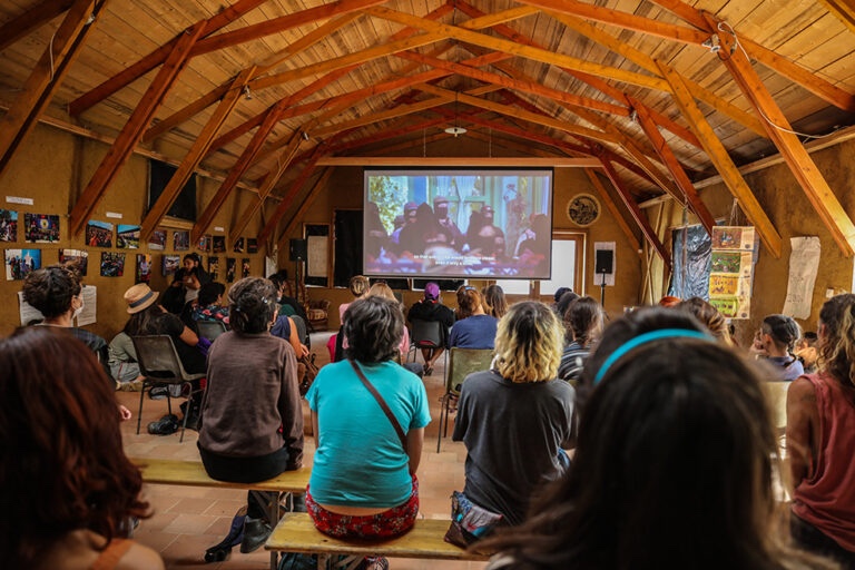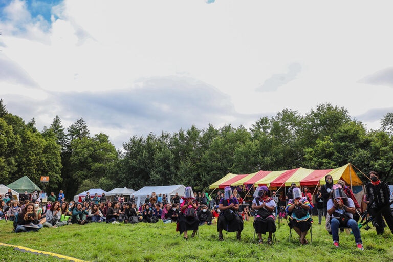 El encuentro inicia con un tambor mapuche invocando a las ancestras en un territorio donde la organización y autogestión de campesinas, finqueros, y activistas solidarias —que ocuparon el bosque a pesar de la expropiación federal— lograron frenar un megaproyecto de aeropuerto que buscaba ser el segundo más grande de Francia, diseñado para el turismo, solo después del Charles de Gaulle en París.