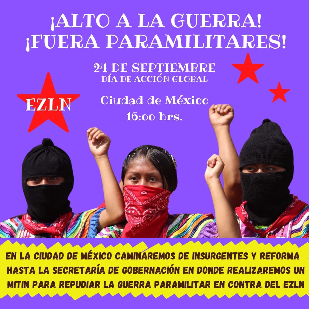 En la Ciudad de México caminaremos de Insurgentes y Reforma hasta la Secretaría de Gobernación en donde realizaremos un mitin para repudiar la guerra paramilitar en contra de las comunidades zapatistas en Chiapas.