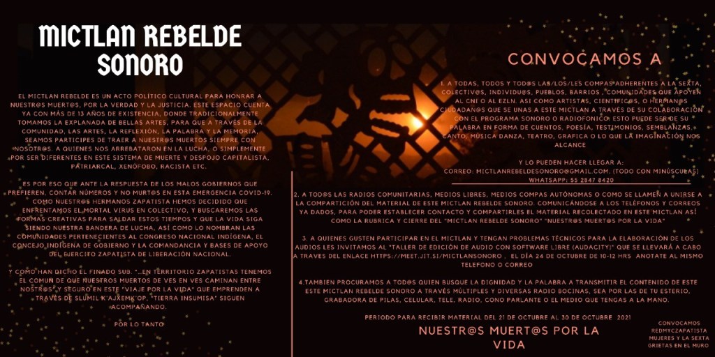 - Invitamos a todas, todos y tod@s las/los/les compas adherentes a la sexta, colectiv@s, individu@s, pueblos, barrios , comunidades que apoyan al CNI, CIG, al EZLN. Así como artistas, cientific@s, herman@s, ciudadan@s, que se unas a este Mictlan a través de su colaboración con el programa sonoro o radiofónico. Esto puede ser de su palabra en forma de cuento, poesía, testimonio, semblanza, canto, música danza, teatro, gráfica o lo que la imaginación nos alcance.