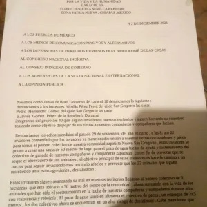 Denunciamos los echos sucedidos el pasado 29 de noviembre del año en curso, a las 8: am 22 invasores comandado por los invasores ya mencionados entran a nuestras tierras con azadones y picos para tomar el potrero colectivo de nuestra comunidad zapatista Nuevo San Gregorio, estos invasores se ponen a crear una sanja de 50 metros de largo para el pozo de agua fuente de ayuda y sostenimiento del colectivo de ganado de nuestros compañeros y compañeras zapatistas con el fin de provocar que se seque el abrevadero de sus animales; el objetivo principal de estos invasores es hacerle camino a un tractor para seguir invadiendo mas territorio rebelde y provocar que los 22 animales que siguen resistiendo ante estas agresiones, desfallezcan.