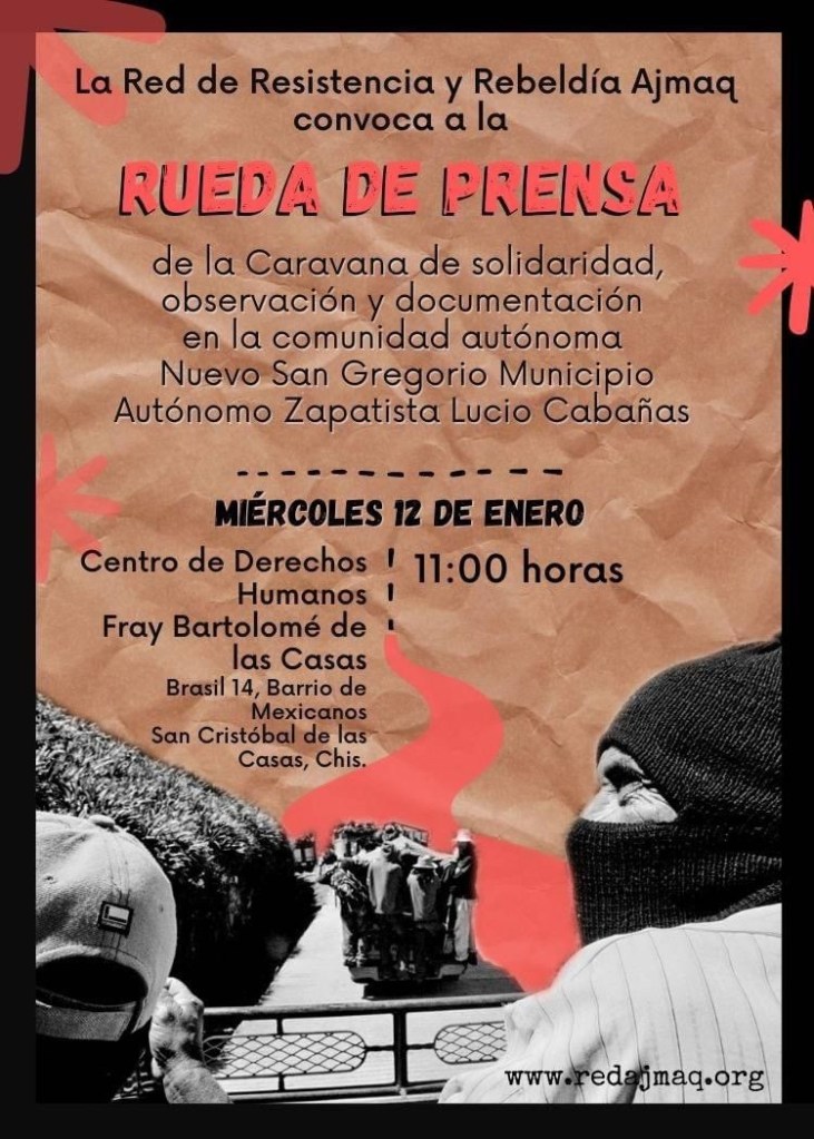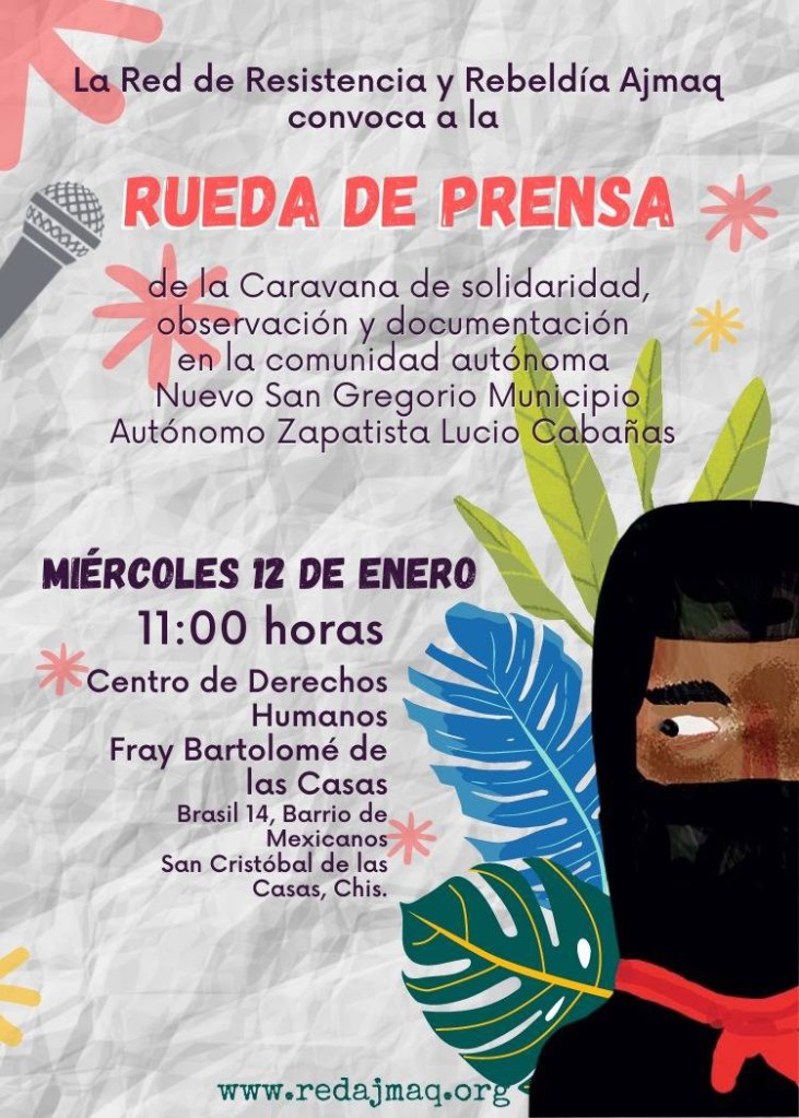 Les invitamos a la Conferencia de Prensa de la Caravana de solidaridad, observación y documentación realizada en la comunidad autónoma zapatista #NuevoSanGregorio a realizarse el 12 de enero a las 11 am., en las oficinas del Centro de Derechos Humanos Frayba, Calle Brasil 14, Barrio de Mexicanos, SCLC.