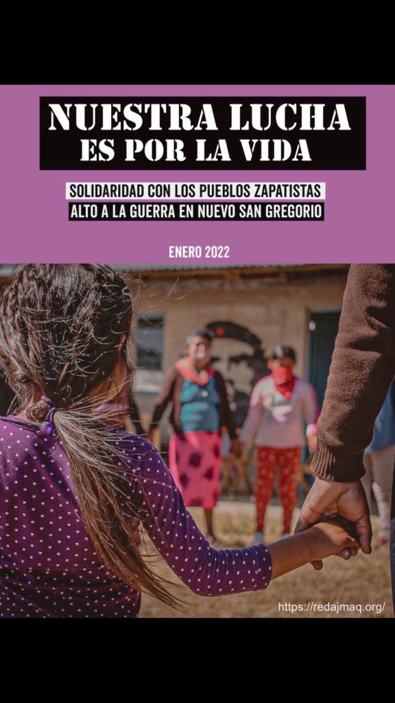 Con la intención de que más y más personas se enteren de la guerra que se emprende contra las comunidades zapatistas, nosotros, nosotras, nosotroas hemos decidido impulsar la campaña Nuestra lucha es por la Vida, que busca desplegar toda nuestra solidaridad con las comunidades zapatistas y exigir el alto a la guerra en la comunidad Nuevo San Gregorio y en otras comunidades en resistencia y rebeldía.