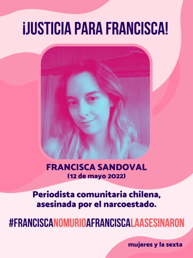 FranciscaNoMurioaFranciscalaAsesinaron ➡️ Francisca Sandoval, comunicadora y periodista comunitaria, recibió un disparo mientras informaba sobre una manifestación del Primero de Mayo en un barrio del centro de Santiago de Chile, tras 12 días luchando por su vida en el hospital, hoy ha partido Francisca.