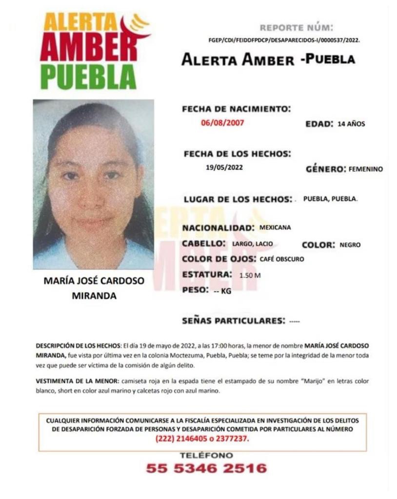 María José Cardoso Miranda, desaparecida el 19 de mayo de 2022 en la Colonia Moctezuma, Puebla, Pue.