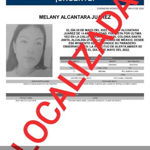 Se activa #AlertaAmber para localizar a la menor de 14 años de edad, de nombre Melany Alcántara Juárez vista por última vez, el día 29 de mayo 2022 en la colonia Santa Anita, alcaldía Iztacalco pic.twitter.com/CZPLSsFWwI— Fiscalía CDMX (@FiscaliaCDMX) May 30, 2022