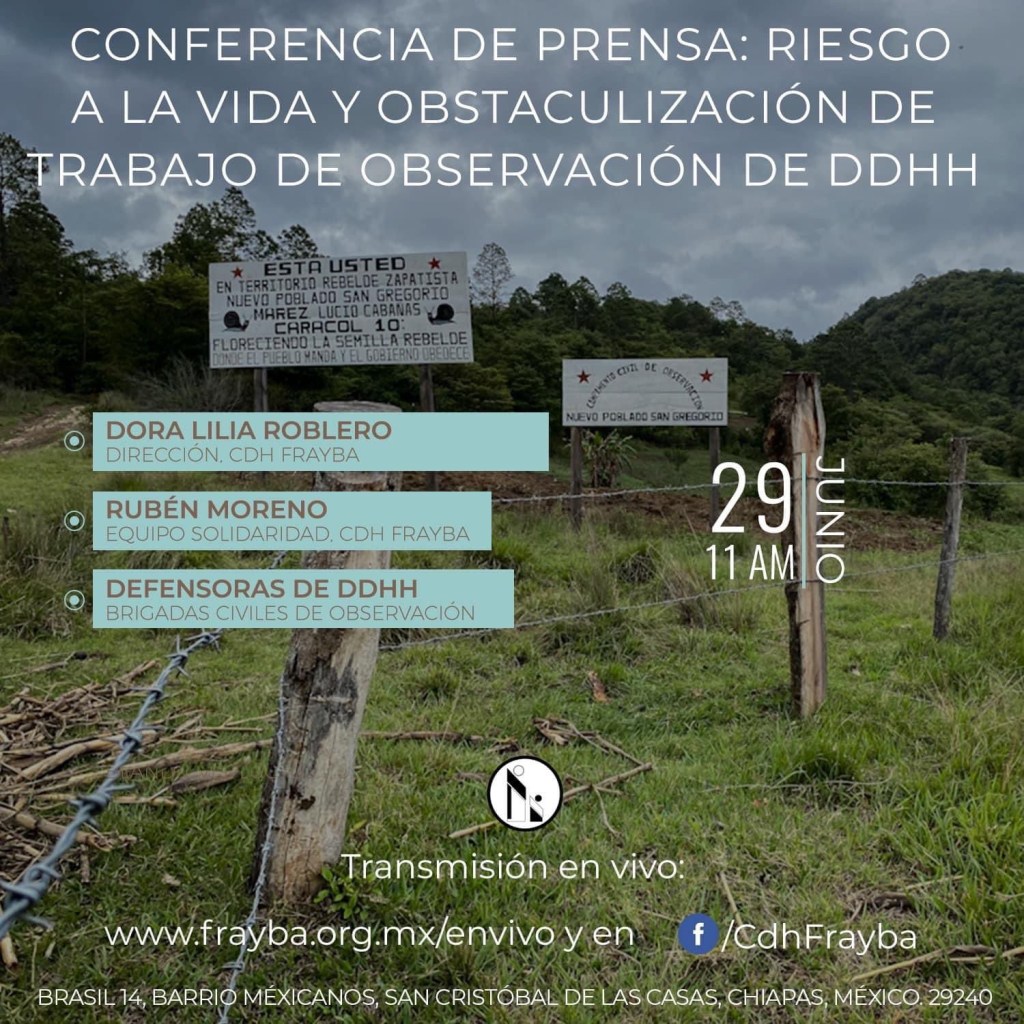 Les invitamos a la #ConferenciaDePrensa en donde compartiremos el riesgo a la vida e integridad personal, así como la obstaculización al trabajo de observación nacional e internacional de derechos humanos que realizan las Brigadas Civiles de Observación (BriCO) del Frayba en la comunidad autónoma zapatista de Nuevo San Gregorio.
