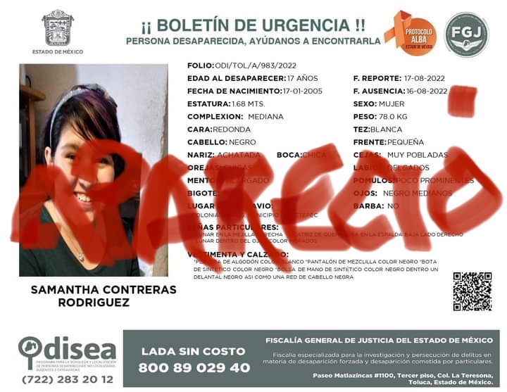 Samantha Contreras Rodrígue está desaparecida desde el 16 de agosto en Metepec YA APARECIÓ
