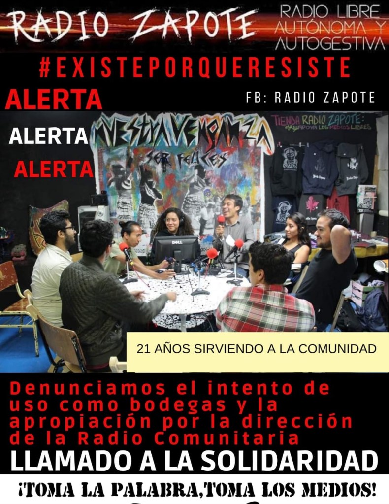 Hacemos un llamado a mantenerse atentos de los acontecimientos en Radio Zapote, les pedimos que difundan esta problemática y nos apoyen para seguir existiendo con digna rebeldía.