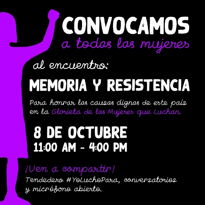 Convocamos a todas las Mujeres al encuentro: Memoria y Resistencia. Sáb 8 de oct, 11am a 4pm. Glorieta de las Mujeres que luchan. CDMX
