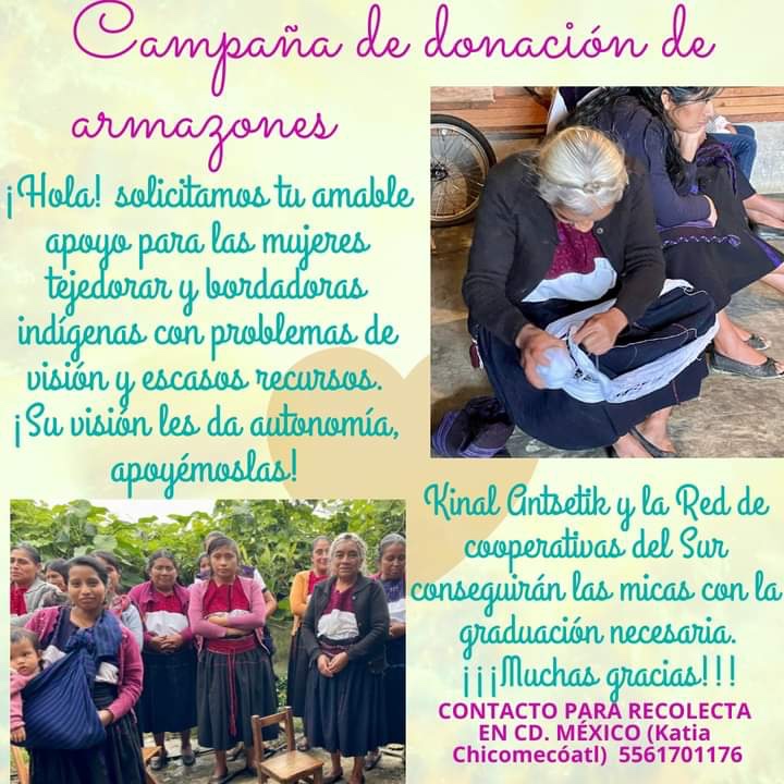 Buenas tardes, nosotras somos una cooperativa de mujeres artistas populares y feministas que trabajamos por el respeto a los derechos de las mujeres de los pueblos originarios de la cuenca y de México, es por ello que hoy nos solidarizamos con las artesanas y tejedoras de la Red de Cooperativas del Sur de la cual también ya somos parte, para hacer llegar lentes a las mujeres bordadoras y fortalecer su autonomía y bienestar, la colecta de armazones en ciudad de México la realizaremos desde la Cooperativa Itzpapalotl y su Casa comunitaria Itzpapalotl, ubicada en San Francisco Tlaltenco alcaldía Tláhuac, aunque también puedes hacer un donativo directo K’inal Antsetik Chiapas.