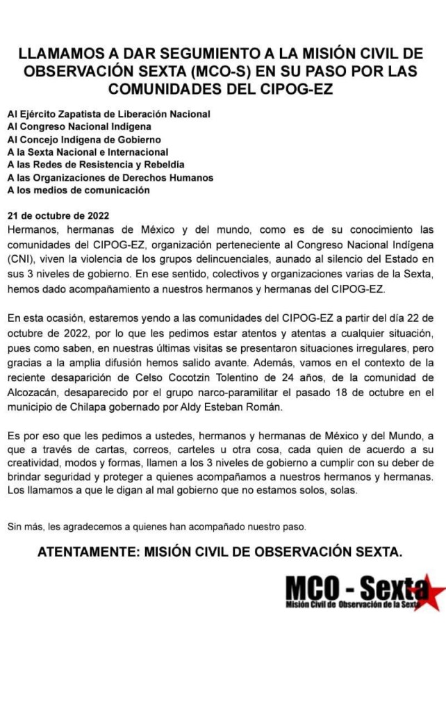 Llamado a dar seguimiento a la misión civil de observación sexta (MCO-S) en su paso por la Comunidades del CIPOG-EZ
