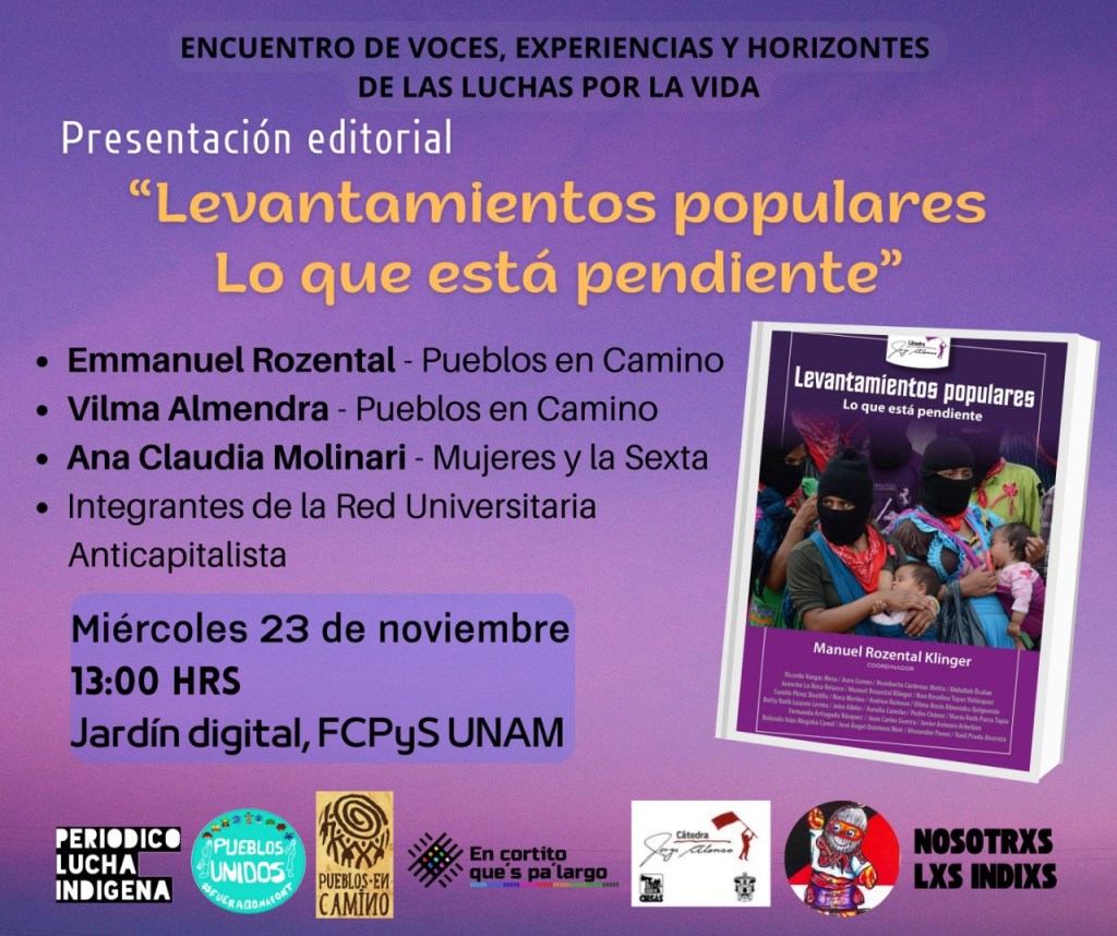 Reunirnos y reflexionar en torno al libro “Levantamientos populares. Lo que está pendiente” es un pre-texto de lo que entre todas y todos vamos a escribir y caminar el camino de la palabra por la libertad y las luchas por la vida hasta que la vida sea una certeza.