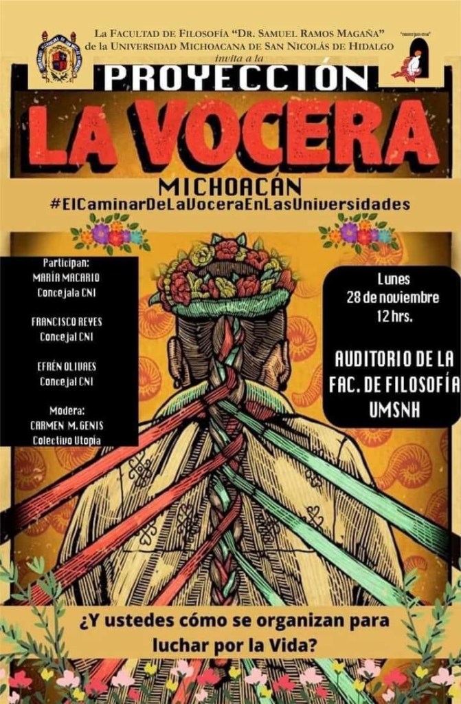 Proyección de documental «La Vocera» en la facultad de Filosofia UMSNH. Congreso Nacional Indigena- Consejo Indígena de Gobierno.