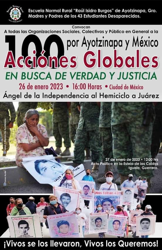 100 acciones globales por Ayotzinapa en busca de verdad y justicia, 26 enero 2023. Ángel de la Independencia al Hemiciclo a Juárez