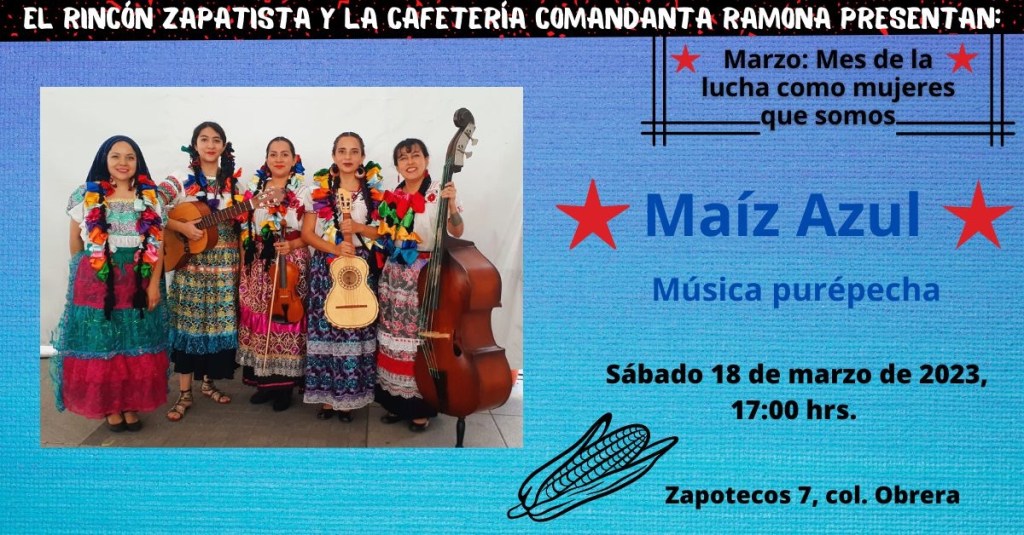 El Rincón Zapatista y la Cafetería Comandanta Ramona te invitan a disfrutar este sábado 18 de marzo a las 17:00 horas, de la agrupación: