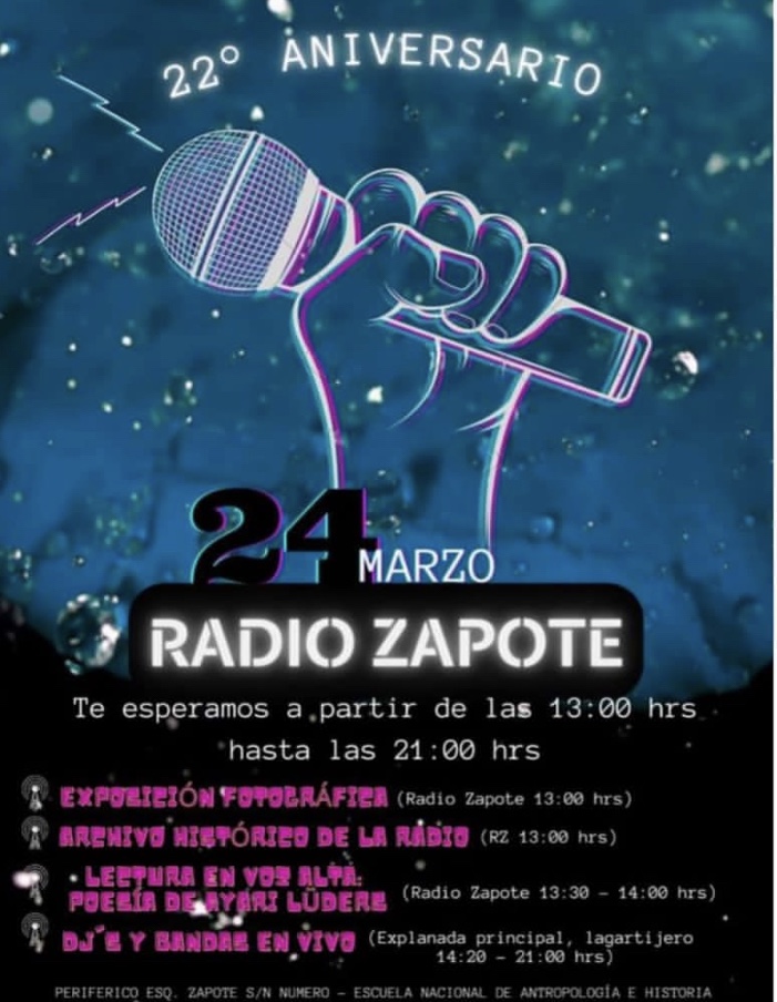 Celebremos 22 años de trabajo desde la comunicación desde la comunicación popular en los medios libres. Invitamos a todos a participar en el evento político-cultural que tendrá lugar en las instalaciones de Radio Zapote y en la Explanada del edificio principal (lagarto) de la Escuela Nacional de Antropología e Historia.