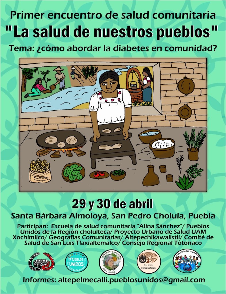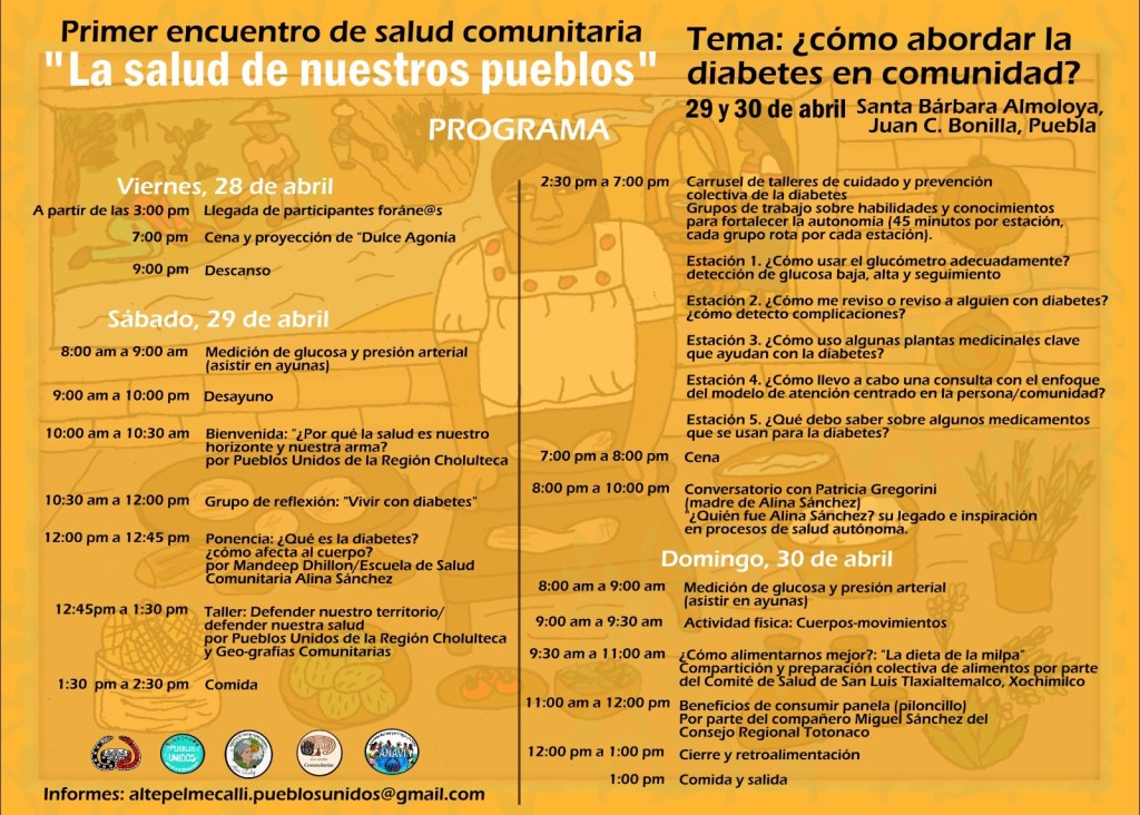 Por todo lo anterior, les hacemos una atenta invitación a participar en nuestro primer encuentro de salud comunitaria en el cual compañeras y compañeros de la región y de otros territorios compartirán saberes en torno a la prevención de la diabetes así como del cuidado individual y colectivo de quienes ya la padecen.
