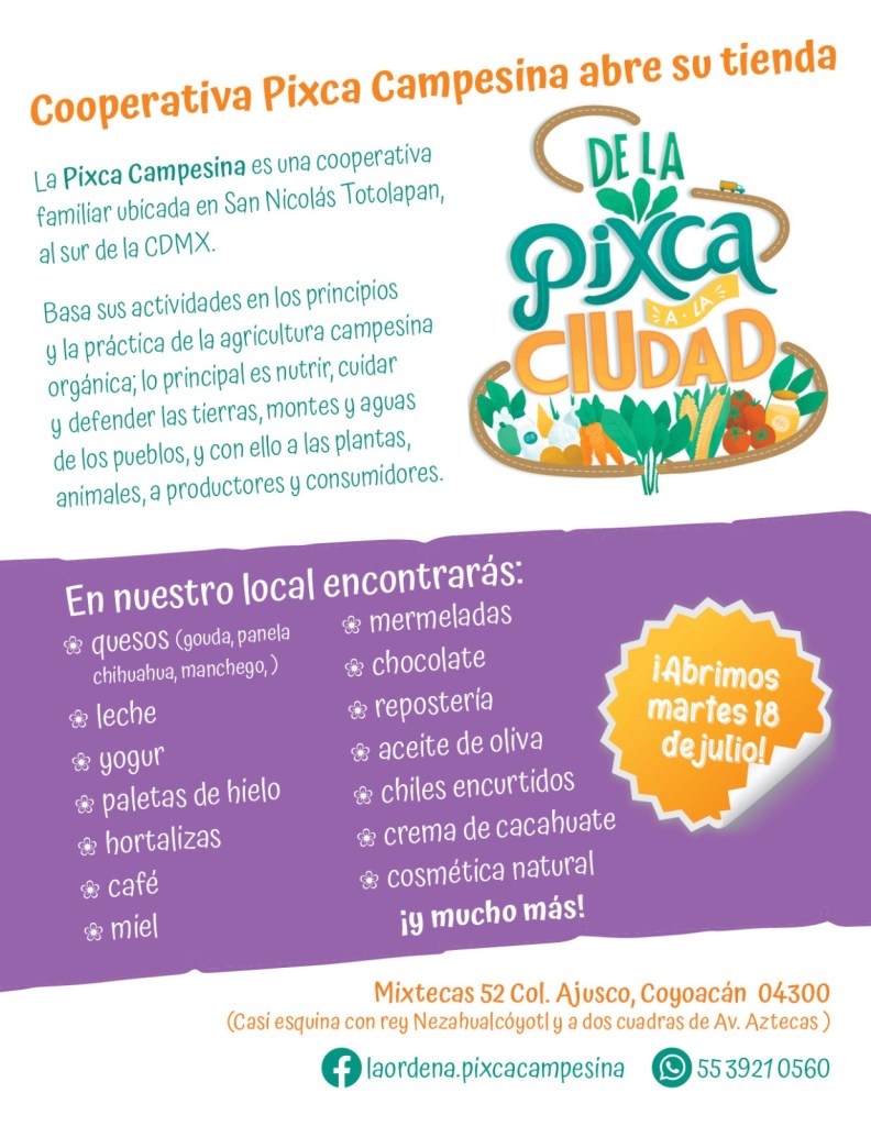Con mucha alegría l@s invitamos el próximo martes 18 de julio a la inauguración de nuestra tienda que se llama “De la Pixca a la ciudad”, ubicada en la calle Mixtecas 50, a dos cuadras de avenida Aztecas.