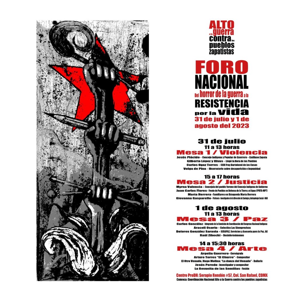 ‼️ Convocamos a encontrarnos en este Foro Nacional con la intención de mirarnos y pensarnos en el escenario de guerra en que actualmente vivimos. Queremos contribuir a la comprensión de esta realidad para que la sociedad despliegue su solidaridad plena y haga suya esta lucha en defensa de la vida y se sume a una campaña permanente de difusión y denuncia de lo que esta guerra significa para los pueblos indígenas y no indígenas, hasta lograr que se detenga. La guerra es una forma de violencia extrema contraria a la política, es intrínseca al sistema capitalista que se impone en el mundo, por ello, buscamos que al horror de la guerra se oponga la rebeldía y la resistencia de una sociedad que fraterniza con los pueblos zapatistas y las comunidades indígenas que aspiran a vivir en un México con justicia y dignidad, con paz y democracia.