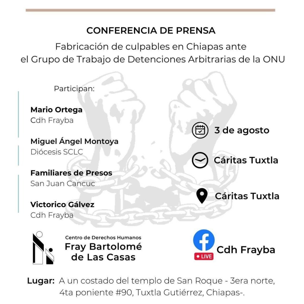 Fabricación de culpables en #Chiapas ante el Grupo de Trabajo de Detenciones Arbitrarias de la #ONU, jueves 3 de agosto, 11am, Caritas Tuxtla